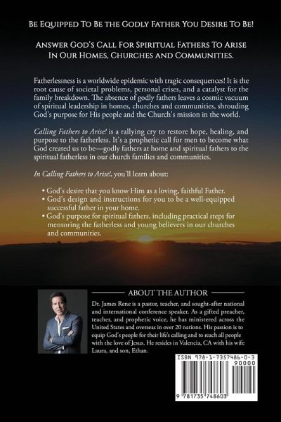 Fatherlessness is a worldwide epidemic with tragic consequences! It is the root cause of societal problems, personal crises, and a catalyst for the family breakdown. The absence of godly fathers leaves a cosmic vacuum of spiritual leadership in homes, churches and communities, shrouding God's purpose for His people and the Church's mission in the world. Calling Fathers to Arise! is a rallying cry to restore hope, healing, and purpose to the fatherless. It's a prophetic call for men to become what God created us to be-godly fathers at home and spiritual fathers to the spiritual fatherless in our church families and communities. In Calling Fathers to Arise!, you'll learn about: ¿ God's desire that you know Him as a loving, faithful Father. ¿ God's design and instructions for you to be a well-equipped successful father in your home. ¿ God's purpose for spiritual fathers, including practical steps for mentoring the fatherless and young believers in our churches and communities. ¿ God's call, role, and function of modern apostolic-church fathers. Dr. James Rene is a pastor, teacher, and sought-after national and international conference speaker. As a gifted preacher, teacher, and prophetic voice, he has ministered across the United States and overseas in over 20 nations. His passion is to equip God's people for their life's calling and to reach all people with the love of Jesus. He resides in Valencia, CA with his wife Laura, and son, Ethan.