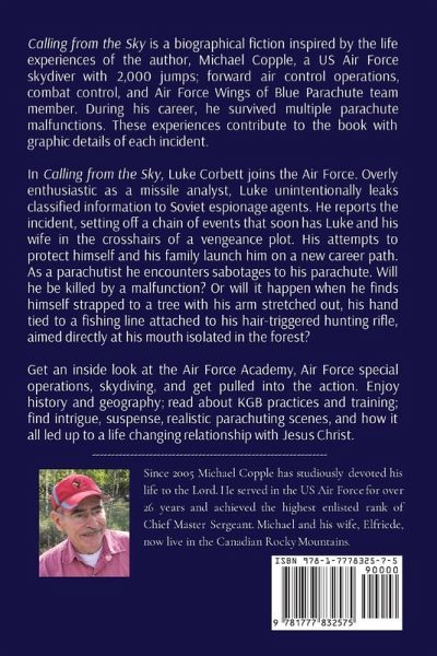 Calling from the Sky is a biographical fiction inspired by the true story of a US Air Force skydiver with 2,000 jumps; forward air control operations, combat control, and Air Force Wings of Blue Parachute team member. The author, Michael Copple, survived true multiple parachute malfunctions during his career. These experiences contribute to the book with graphic details of each incident. In Calling from the Sky, Luke Corbett, the high achiever, star miler, and Eagle Scout, joins the Air Force in 1961 having no idea of the dangers that await him. Overly enthusiastic as a missile analyst, Luke unintentionally leaks classified information to Soviet spies. He reports the incident, setting off a chain of events that soon has Luke and his wife, Cheryl, in the crosshairs of a vengeance plot. His attempts to protect himself and his family launch him on a new career path. As a parachutist he encounters sabotages to his parachute resulting in malfunctions. Will he be killed by a malfunction? Or will it happen when he finds himself strapped to a tree with his arm stretched out, his hand tied to a fishing line attached to his hair-triggered hunting rifle, aimed directly at his mouth isolated in the forest? Will the Truth set him free? Follow Luke along and get an inside look at the Air Force Academy, Air Force special operations, and skydiving. Let Luke pull you into the action as if he is describing your actions and decisions ... and the consequences. Enjoy history and geography; read about KGB practices and training; find intrigue, suspense, and realistic parachuting scenes, and how it all led up to a life changing relationship with Jesus Christ.