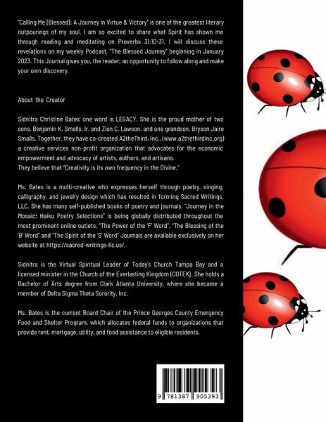 "Calling Me {Blessed}: A Journey in Virtue & Victory" is the greatest literary outpourings of my soul. I am excited to share what Spirit has shown me about my amazing self through the revelation reading and meditating on Proverbs 31:10-31. I am discovering to not allow my past decisions to define the rest of my life. Those decisions are not in totality who I am or who you are. The greatest versions of ourselves are still on the inside and will reveal themselves as we evolve & grow."