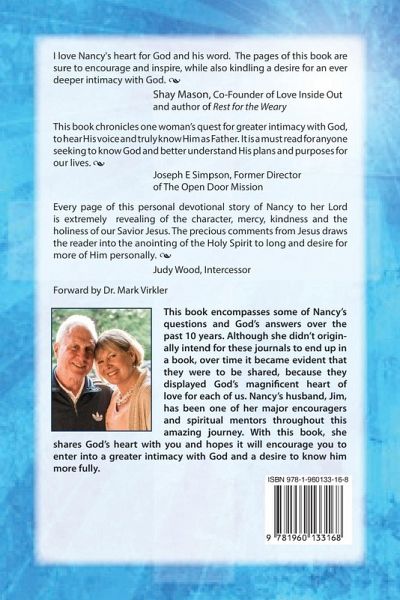 This book encompasses some of Nancy's questions and God's answers over the past 10 years. Although she didn't originally intend for these journals to end up in a book, over time it became evident that they were to be shared, because they displayed God's magnificent heart of love for each of us. Nancy's husband, Jim, has been one of her major encouragers and spiritual mentors throughout this amazing journey. With this book, she shares God's heart with you and hopes it will encourage you to enter into a greater intimacy with God and a desire to know him more fully.