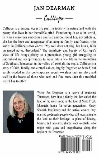 Calliope is a unique, eccentric soul, in touch with nature and with the poetry that lives in her incredible mind. Functioning in an alien world, in which emotions sometimes confuse and confound her, nevertheless, she has the love and acceptance of an adopted family and friends, who know, in Calliope's own words: "My soul does not sing, but hums, With measured notes, discordant." The simplicity and beauty of Calliope's view of life brings clarity to a precocious young girl struggling to understand and accept tragedy to move into a new life in the mountains of Southeast Tennessee, in the valley of uwohali, the eagle. Calliope is a story of faith, family, and eternal values, largely forgotten or denied, but sorely needed in this contemporary society-values that are alive and well in the hearts of those who seek and find more than this troubled world has to offer. Writer Jan Dearman is a native of southeast Tennessee, born into a family that has called the land of the river gorge at the foot of Suck Creek Mountain home for seven generations. Hardy Scottish forefathers and the native women they married produced a people who, still today, cling to the land as their heritage-a place of history, beauty, and ancestry, shared with uwohali, who reigns with grace and magnificence along the banks of the Tennessee.