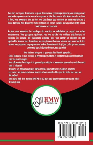 Vous êtes sur le point de découvrir un guide d'exercices de gymnastique éprouvé pour développer des muscles incroyables sur votre corps et vous pouvez le faire chez vous ou à l'extérieur dans la rue. Dans ce livre, vous apprendrez tout ce dont vous avez besoin pour démarrer en toute sécurité dans la bonne direction. Vous découvrirez même certaines des erreurs cruciales que vous devez éviter lors de l'exécution de ces exercices! De plus, vous apprendrez les avantages des exercices de callisthénie par rapport aux autres entraînements. Vous partagerez également avec vous certains des meilleurs entraînements et exercices (qui incluent des illustrations visuelles) pour vous donner les résultats les plus significatifs. Vous ne vous demanderez pas non plus quoi faire une fois que vous aurez fini de lire, car nous vous proposons un programme de routine d'entraînement de 30 jours, afin que vous puissiez commencer dans la bonne direction, tout de suite! Voici juste un aperçu de ce que vous allez bientôt apprendre... - Enfin, découvrez en quoi consiste la gymnastique suédoise et comment vous pouvez rapidement créer du muscle maigre! - Vous découvrirez l'avantage de la gymnastique suédoise et apprendrez pourquoi ces entraînements sont si efficaces! - Découvrez les meilleurs exercices HOME & STREET pour obtenir les meilleurs résultats! - Les erreurs les plus courantes de l'exercice et des conseils utiles pour les éviter tous vous ont été révélés! - Vous aurez droit à un exercice ROUTINE de 30 jours pour pouvoir commencer tout de suite! - Beaucoup plus!