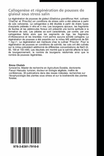 La régénération de pousses de glaïeul (Gladiolus grandiflorus Hort. cultivars ChaCha et Priscilla ) en conditions de stress salin a été obtenue à partir de cals cellulaires. La callogenèse a été étudiée à partir de divers types d explants prélevés in vitro et in vivo. Les bourgeons apicaux, les fragments de feuilles et les pédoncules floraux ont présenté une bonne aptitude à la formation de cals. Les pétales se sont caractérisés, par contre, par une callogenèse faible alors que les segments de tige, les fragments d inflorescence et les bractées n ont permis aucune activité callogène. La régénération de pousses a été possible sur le milieu MS additionné de BA 1 mg.l-1. La régénération est meilleure chez le cultivar Priscilla . Pour la régénération de pousses en conditions de salinité, les cals ont été cultivés sur le milieu précédent additionné de différentes concentrations de NaCl (0, 50, 100 et 150 mM). Les résultats ont montré que la salinité affecte le taux de bourgeonnement, le nombre de bourgeons néoformés ainsi que le nombre de pousses régénérées.
