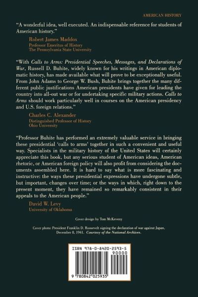 Calls to Arms: Presidential Speeches, Messages, and Declarations of War is a collection of presidential messages and speeches that called America to war from John Adams and the Quasi-War with France to George W. Bush and the fight against international terrorism in Afghanistan. The documents included here demonstrate the growth of presidential power and show how Congress responded to each call to arms. The selections also reflect the adherence to constitutional requirements and in the case of undeclared war messages, the evolution of "extra-constitutional" behavior. In addition, the book provides a sample of the popular responses to calls to arms throughout history and provides a handy reference for studying some of the most memorable presidential speeches. A fascinating collection of some of the most important speeches in our country's history, Calls to Arms will appeal to all those interested in American, diplomatic, and military history.