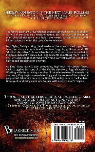 The fabled Elephant Graveyard has been discovered. It contains enough ivory to make Ethiopia a wealthy nation. But the cave contains more than physical riches-it also holds the means to control the world. Fifteen scientists enter the cave. Only one leaves.Jack Sigler, Callsign: King (field leader of the covert, black ops Chess Team) receives a cryptic text from Sara Fogg, his girlfriend and CDC "disease detective." A catastrophic disease has been reported in Ethiopia's Great Rift Valley, but Fogg suspects something more is going on. Her suspicion is confirmed when King's arrival in Africa is met by a high speed assassination attempt.As King fights against two competing, high-tech mercenary forces, each struggling for control of the deadly discovery, Fogg disappears. Working with the surviving member of the science team that made the discovery, King begins a search for Fogg and the source of the potential plague that takes him back to the Great Rift Valley, back to the Elephant Graveyard, and brings him face-to-face with modern man's origins.