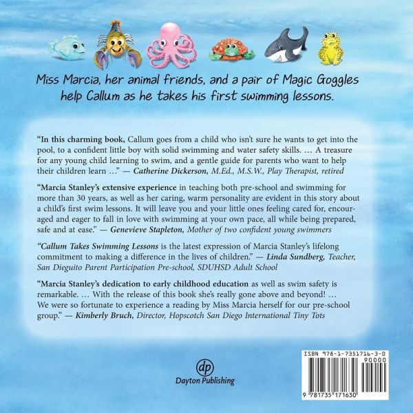 Callum Takes Swimming Lessons is a treasure for any young child learning to swim, and a gentle guide for parents who want to help their children learn and keep them safe in the pool. At the beginning of this heartwarming story about a child's first season of swimming lessons, Callum's swim teacher, Miss Marcia, earns his trust and draws on his natural curiosity and imagination to help him feel comfortable in the water. Callum has a lot of fun with Miss Marcia and her little "animal friends," who help him learn. Colorful illustrations show what happens at each step as Callum and Miss Marcia enjoy his lessons. By the end of his first set of lessons, Callum has gone from a child who wasn't quite sure he wanted to get into the pool to a confident little boy with solid swimming and water-safety skills. He can float on his front and back, swim underwater, and lift his head to take a breath. He can jump into the pool and swim across to the other side, taking a breath whenever he needs one. He has also learned important safety rules, and techniques for staying safe in the pool. And he's looking forward to coming back for more lessons next summer. At the back of the book is a section for grown-ups, with tips for keeping children safe in and around swimming pools. An experienced and patient instructor, author Marcia Stanleyhas taught swimming lessons for more than 30 years, and also taught preschool for many years. She wrote Callum Takes Swimming Lessons because she feels strongly about the advantages of learning to swim. "While most people look at swimming as a recreational activity," she says, "it's also a safety measure. All children should learn how to swim."