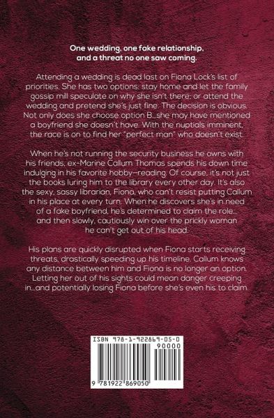 One wedding, one fake relationship, and a threat no one saw coming. Attending a wedding is dead last on Fiona Lock's list of priorities. She has two options: stay home and let the family gossip mill speculate on why she isn't there; or attend the wedding and pretend she's just fine. The decision is obvious. Not only does she choose option B...she may have mentioned a boyfriend she doesn't have. With the nuptials imminent, the race is on to find her "perfect man" who doesn't exist. When he's not running the security business he owns with his friends, ex-Marine Callum Thomas spends his down time indulging in his favorite hobby-reading. Of course, it's not just the books luring him to the library every other day. It's also the sexy, sassy librarian, Fiona, who can't resist putting Callum in his place at every turn. When he discovers she's in need of a fake boyfriend, he's determined to claim the role...and then slowly, cautiously win over the prickly woman he can't get out of his head. His plans are quickly disrupted when Fiona starts receiving threats, drastically speeding up his timeline. Callum knows any distance between him and Fiona is no longer an option. Letting her out of his sights could mean danger creeping in...and potentially losing Fiona before she's even his to claim.