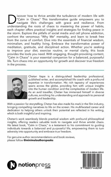 Discover how to thrive amidst the turbulence of modern life with "Calm in Chaos." This transformative guide empowers you to navigate life's challenges with grace and resilience. From understanding the roots of chaos to mastering the power of habits, each chapter offers practical insights and strategies for finding peace in the storm. Explore the pitfalls of social media and cell phone addiction, confront the venomous "Why Me" mentality, and learn to break free from the curse of comfort. Dive into the essentials of financial wisdom, minimalism, and healthy living. Embrace the transformative power of meditation, gratitude, and disciplined action. Whether you're seeking to improve your diet, exercise routine, or mental clarity, this book provides the tools you need. With engaging, thought-provoking content, "Calm in Chaos" is your essential companion for a balanced, purposeful life. Turn chaos into an opportunity for growth and discover true freedom in the process.