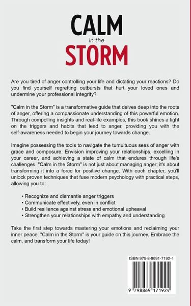 Are you tired of anger controlling your life and dictating your reactions? Do you find yourself regretting outbursts that hurt your loved ones and undermine your professional integrity? "Calm in the Storm" is a transformative guide that delves deep into the roots of anger, offering a compassionate understanding of this powerful emotion. Through compelling insights and real-life examples, this book shines a light on the triggers and habits that lead to anger, providing you with the self-awareness needed to begin your journey towards change. Imagine possessing the tools to navigate the tumultuous seas of anger with grace and composure. Envision improving your relationships, excelling in your career, and achieving a state of calm that endures through life's challenges. "Calm in the Storm" is not just about managing anger; it's about transforming it into a force for positive change. With each chapter, you'll unlock proven techniques that fuse modern psychology with practical steps, allowing you to: Recognize and dismantle anger triggers Communicate effectively, even in conflict Build resilience against stress and emotional upheaval Strengthen your relationships with empathy and understanding Take the first step towards mastering your emotions and reclaiming your inner peace. "Calm in the Storm" is your guide on this journey. Embrace the calm, and transform your life today!