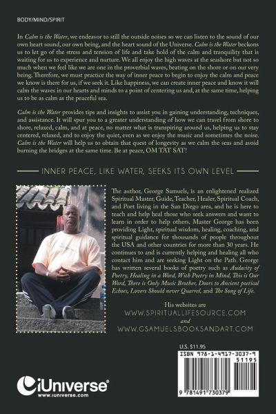 In Calm is the Water, we endeavor to still the outside noises so we can listen to the sound of our own heart sound, our own being, and the heart sound of the Universe. Calm is the Water beckons us to let go of the stress and tension of life and take hold of the calm and tranquility that is waiting for us to experience and nurture. We all enjoy the high waves at the seashore but not so much when we feel like we are one in the proverbial waves, beating on the shore or on our very being. Therefore, we must practice the way of inner peace to begin to enjoy the calm and peace we know is there for us, if we seek it. Like happiness, we can create inner peace and know it will calm the waves in our hearts and minds to a point of centering us and, at the same time, helping us to be as calm as the peaceful sea. Calm is the Water provides tips and insights to assist you in gaining understanding, techniques, and assistance. It will spur you to a greater understanding of how we can travel from shore to shore, relaxed, calm, and at peace, no matter what is transpiring around us, helping us to stay centered, relaxed, and to enjoy the quiet, even as we enjoy the music and sometimes the noise. Calm is the Water will help us to obtain that quest of longevity as we calm the seas and avoid burning the bridges at the same time. Be at peace, OM TAT SAT!