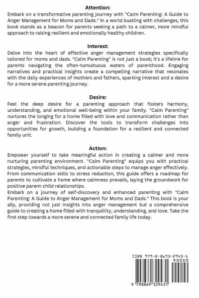 Attention: Embark on a transformative parenting journey with "Calm Parenting: A Guide to Anger Management for Moms and Dads". In a world bustling with challenges, this book stands as a beacon for parents seeking a path to a calmer, more mindful approach to raising resilient and emotionally healthy children. Interest: Delve into the heart of effective anger management strategies specifically tailored for moms and dads. "Calm Parenting" is not just a book; it's a lifeline for parents navigating the often-tumultuous waters of parenthood. Engaging narratives and practical insights create a compelling narrative that resonates with the daily experiences of mothers and fathers, sparking interest and a desire for a more serene parenting journey. Desire: Feel the deep desire for a parenting approach that fosters harmony, understanding, and emotional well-being within your family. "Calm Parenting" nurtures the longing for a home filled with love and communication rather than anger and frustration. Discover the tools to transform challenges into opportunities for growth, building a foundation for a resilient and connected family unit. Action: Empower yourself to take meaningful action in creating a calmer and more nurturing parenting environment. "Calm Parenting" equips you with practical strategies, mindful techniques, and actionable steps to manage anger effectively. From communication skills to stress reduction, this guide offers a roadmap for parents to cultivate a home where calmness prevails, laying the groundwork for positive parent-child relationships. Embark on a journey of self-discovery and enhanced parenting with "Calm Parenting: A Guide to Anger Management for Moms and Dads". This book is your ally, providing not just insights into anger management but a comprehensive guide to creating a home filled with tranquillity, understanding, and love. Take the first step towards a more serene and connected family life today.