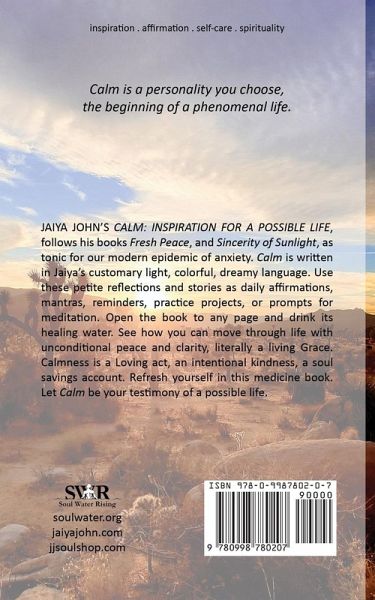 Jaiya John’s Calm: Inspiration for a Possible Life, follows his books Fresh Peace, and Sincerity of Sunlight, as tonic for our modern epidemic of anxiety. Calm is written in Jaiya’s customary light, colorful, dreamy language. Use these petite reflections and stories as daily affirmations, mantras, reminders, practice projects, or prompts for meditation. Open the book to any page and drink its healing water. See how you can move through life with unconditional peace and clarity, literally a living Grace. Calmness is a Loving act, an intentional kindness, a soul savings account. Refresh yourself…mehr