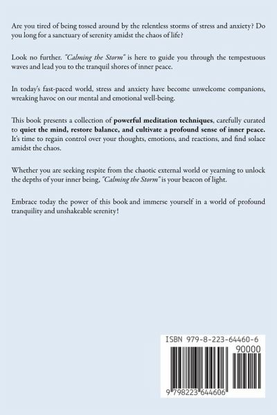 Are you tired of being tossed around by the relentless storms of stress and anxiety? Do you long for a sanctuary of serenity amidst the chaos of life? Look no further. "Calming the Storm" is here to guide you through the tempestuous waves and lead you to the tranquil shores of inner peace. In today's fast-paced world, stress and anxiety have become unwelcome companions, wreaking havoc on our mental and emotional well-being. The constant demands and pressures leave us feeling overwhelmed, restless, and disconnected from our true selves. The storms of life seem relentless, leaving us desperately searching for an anchor of calmness and serenity. But fear not, for within the pages of this remarkable book lies the solution to your struggles. This book presents a collection of powerful meditation techniques, carefully curated to quiet the mind, restore balance, and cultivate a profound sense of inner peace. It's time to regain control over your thoughts, emotions, and reactions, and find solace amidst the chaos. You will find:Mindful meditation techniques: Discover a variety of mindfulness-based meditation techniques to quiet the mind and find inner peace. Stress and anxiety relief: Learn effective strategies to reduce stress and anxiety, allowing you to navigate life's challenges with calmness and resilience. Cultivating self-awareness: Develop a deeper understanding of yourself through guided meditation practices, fostering self-reflection and personal growth. Restoring balance and harmony: Explore meditation exercises designed to restore balance and harmony to your mind, body, and spirit. Embracing inner peace: Unlock the transformative power of meditation and experience the profound serenity and fulfillment that comes from within. and much more Whether you are seeking respite from the chaotic external world or yearning to unlock the depths of your inner being, "Calming the Storm" is your beacon of light. Let its transformative pages guide you through the tumultuous waves of life and lead you to the tranquil shores of inner serenity. Embrace today the power of this book and immerse yourself in a world of profound tranquility and unshakeable serenity!
