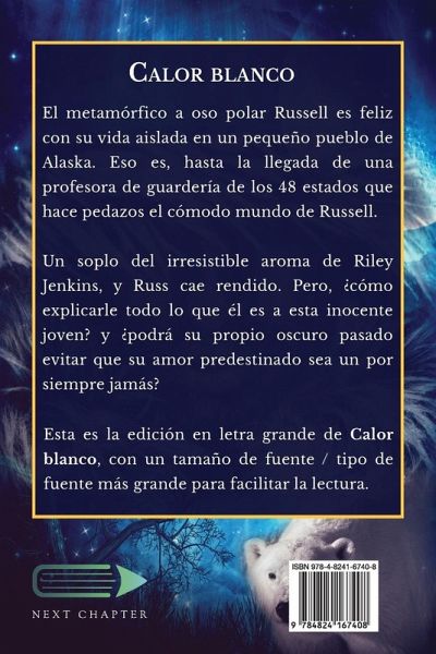 El metamórfico a oso polar Russell es feliz con su vida aislada en un pequeño pueblo de Alaska. Eso es, hasta la llegada de una profesora de guardería de los 48 estados que hace pedazos el cómodo mundo de Russell. Un soplo del irresistible aroma de Riley Jenkins, y Russ cae rendido. Pero, ¿cómo explicarle todo lo que él es a esta inocente joven? y ¿podrá su propio oscuro pasado evitar que su amor predestinado sea un por siempre jamás? Esta es la edición en letra grande de Calor blanco, con un tamaño de fuente / tipo de fuente más grande para facilitar la lectura.