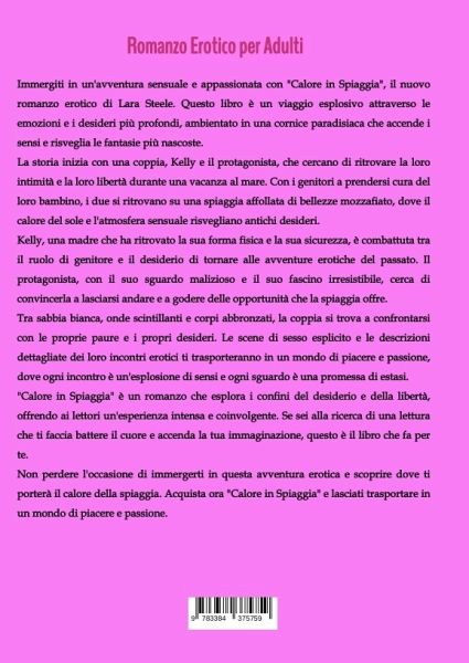 Immergiti in un'avventura sensuale e appassionata con "Calore in Spiaggia", il nuovo romanzo erotico di Lara Steele. Questo libro è un viaggio esplosivo attraverso le emozioni e i desideri più profondi, ambientato in una cornice paradisiaca che accende i sensi e risveglia le fantasie più nascoste.La storia inizia con una coppia, Kelly e il protagonista, che cercano di ritrovare la loro intimità e la loro libertà durante una vacanza al mare. Con i genitori a prendersi cura del loro bambino, i due si ritrovano su una spiaggia affollata di bellezze mozzafiato, dove il calore del sole e l'atmosfera sensuale risvegliano antichi desideri.Kelly, una madre che ha ritrovato la sua forma fisica e la sua sicurezza, è combattuta tra il ruolo di genitore e il desiderio di tornare alle avventure erotiche del passato. Il protagonista, con il suo sguardo malizioso e il suo fascino irresistibile, cerca di convincerla a lasciarsi andare e a godere delle opportunità che la spiaggia offre.Tra sabbiabianca, onde scintillanti e corpi abbronzati, la coppia si trova a confrontarsi con le proprie paure e i propri desideri. Le scene di sesso esplicito e le descrizioni dettagliate dei loro incontri erotici ti trasporteranno in un mondo di piacere e passione, dove ogni incontro è un'esplosione di sensi e ogni sguardo è una promessa di estasi."Calore in Spiaggia" è un romanzo che esplora i confini del desiderio e della libertà, offrendo ai lettori un'esperienza intensa e coinvolgente. Se sei alla ricerca di una lettura che ti faccia battere il cuore e accenda la tua immaginazione, questo è il libro che fa per te.Non perdere l'occasione di immergerti in questa avventura erotica e scoprire dove ti porterà il calore della spiaggia. Acquista ora "Calore in Spiaggia" e lasciati trasportare in un mondo di piacere e passione.
