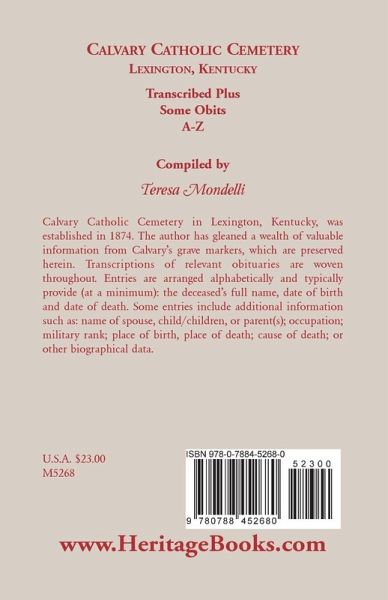 Calvary Catholic Cemetery in Lexington, Kentucky, was established in 1874. The author has gleaned a wealth of valuable information from Calvary's grave markers, which are preserved herein. Transcriptions of relevant obituaries are woven throughout. Entries are arranged alphabetically and typically provide (at a minimum): the deceased's full name, date of birth and date of death. Some entries include additional information such as: name of spouse, child/children, or parent(s); occupation; military rank; place of birth, place of death; cause of death; or other biographical data.