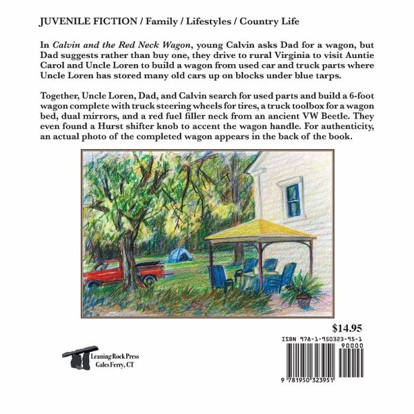 In Calvin and the Red Neck Wagon, young Calvin asks Dad for a wagon, but Dad suggests rather than buy one, they drive to rural Virginia to visit Auntie Carol and Uncle Loren to build a wagon from used car and truck parts where Uncle Loren has stored many old cars up on blocks under blue tarps. Together, Uncle Loren, Dad, and Calvin search for used parts and build a 6-foot wagon complete with truck steering wheels for tires, a truck toolbox for a wagon bed, dual mirrors, and a red fuel filler neck from an ancient VW Beetle. They even found a Hurst shifter knob to accent the wagon handle. For…mehr