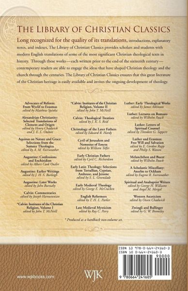 This volume, demonstrating the main elements of Calvin's doctrine as they appear in his many commentaries on the books of the Old and New Testaments, speaks with singular power to the ordinary reader today. Included are more than two hundred selections under headings ranging from the Bible, knowledge of God, and the church. Introductory selections from Calvin's own writings also are provided. Long recognized for the quality of its translations, introductions, explanatory notes, and indexes, the Library of Christian Classics provides scholars and students with modern English translations of some of the most significant Christian theological texts in history. Through these works--each written prior to the end of the sixteenth century--contemporary readers are able to engage the ideas that have shaped Christian theology and the church through the centuries.