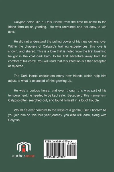From the time he came to the Idaho ranch as a yearling, Calypso acted like a 'Dark Horse.' This meant he was undisciplined in his ways, and not easy to win over. The young horse did not understand the attracting power of his new owners' love. Within these chapters of Calypso's training experiences, love is shown and shared from the first brushing he got in the cold, dark barn; to his first adventure away from the comfort of his corral. In the Dark Horse's growing up years, he encounters many new friends. Part of Calypso's temperament was that he was always a curious horse, which often got him into a lot of trouble. Would he ever conform to the ways of a gentle and useful horse? As you join Calypso on his four year journey, you also will learn-first, from the listing of new vocabulary words in each chapter, and second, you will learn ideas on how to train your own horse, just as Grandpa did. [Most all of the incidents described in the book really happened, except for the 2, 'Dream' chapters.] Enjoy, Lenore