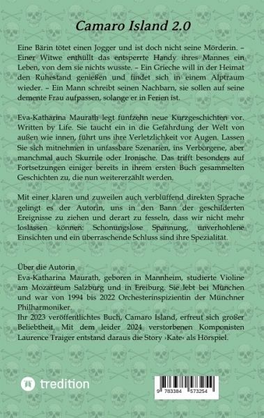 Eine Bärin tötet einen Jogger und ist doch nicht seine Mörderin.¬ ¬- Einer Witwe enthüllt das entsperrte Handy ihres Mannes ein Leben, von dem sie nichts wusste. - Ein Grieche will in der Heimat den Ruhestand genießen und findet sich in einem Alptraum wieder. - Ein Mann schreibt seinen Nachbarn, sie sollen auf seine demente Frau aufpassen, solange er in Ferien ist. -Eva-Katharina Maurath legt fünfzehn neue Kurzgeschichten vor. Written by Life. Sie taucht ein in die Gefährdung der Welt von außen wie innen, führt uns ihre Verletzlichkeit vor Augen. Lassen Sie sich mitnehmen in unfassbare Szenarien, ins Verborgene, aber manchmal auch Skurrile oder Ironische. Das trifft besonders auf Fortsetzungen einiger bereits in ihrem ersten Buch gesammelten Geschichten zu, die nun weitererzählt werden.Mit einer klaren und zuweilen auch verblüffend direkten Sprache gelingt es der Autorin, uns in den Bann der geschilderten Ereignisse zu ziehen und derart zu fesseln, dass wir nicht mehr loslassen können: Schonungslose Spannung, unverhohlene Einsichten und ein überraschende Schluss sind ihre Spezialität.