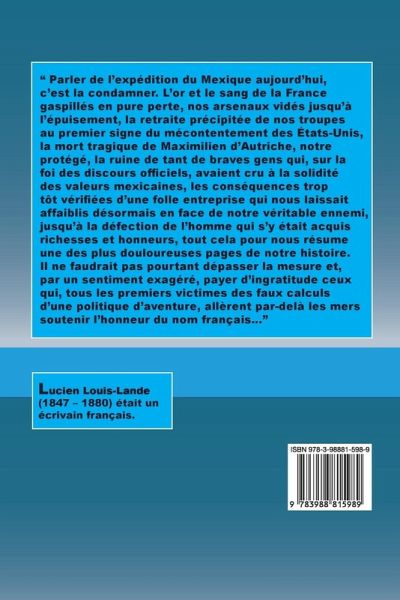 " Parler de l'expédition du Mexique aujourd'hui, c'est la condamner. L'or et le sang de la France gaspillés en pure perte, nos arsenaux vidés jusqu'à l'épuisement, la retraite précipitée de nos troupes au premier signe du mécontentement des États-Unis, la mort tragique de Maximilien d'Autriche, notre protégé, la ruine de tant de braves gens qui, sur la foi des discours officiels, avaient cru à la solidité des valeurs mexicaines, les conséquences trop tôt vérifiées d'une folle entreprise qui nous laissait affaiblis désormais en face de notre véritable ennemi, jusqu'à la défection de l'homme qui s'y était acquis richesses et honneurs, tout cela pour nous résume une des plus douloureuses pages de notre histoire. Il ne faudrait pas pourtant dépasser la mesure et, par un sentiment exagéré, payer d'ingratitude ceux qui, tous les premiers victimes des faux calculs d'une politique d'aventure, allèrent par-delà les mers soutenir l'honneur du nom français..."