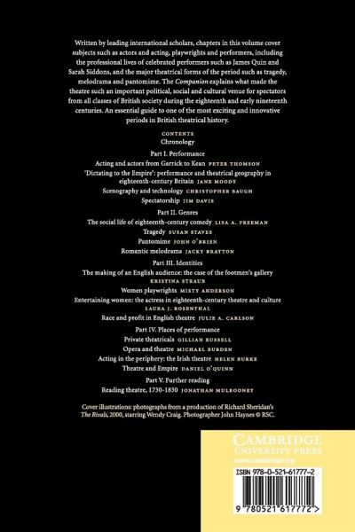 This Companion offers a wide-ranging and innovative guide to one of the most exciting and important periods in British theatrical history. The scope of the volume extends from the age of Garrick to the Romantic transformation of acting inaugurated by Edmund Kean. It brings together cutting-edge scholarship from leading international scholars in the long eighteenth century, offering lively and original insights into the world of the stage, its most influential playwrights and the professional lives of celebrated performers such as James Quin, George Anne Bellamy, John Philip Kemble, Dora Jordan, Fanny Abington and Sarah Siddons. The volume includes essential chapters about eighteenth-century acting, production and audiences, important surveys of key theatrical forms such as tragedy, comedy, melodrama and pantomime as well as a range of exciting thematic essays on subjects such as private theatricals, 'black' theatre and the representation of empire.