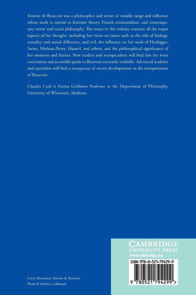 Simone de Beauvoir was a philosopher and writer of notable range and influence whose work is central to feminist theory, French existentialism, and contemporary moral and social philosophy. The essays in this 2003 volume examine all the major aspects of her thought, including her views on issues such as the role of biology, sexuality and sexual difference, and evil, the influence on her work of Heidegger, Sartre, Merleau-Ponty, Husserl, and others, and the philosophical significance of her memoirs and fiction. New readers and nonspecialists will find this the most convenient and accessible guide to Beauvoir currently available. Advanced students and specialists will find a conspectus of recent developments in the interpretation of Beauvoir.