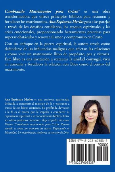 En este libro, explicare los problemas reales que enfrentan los matrimonios en este siglo. Te revelo los 10 secretos para tener un matrimonio feliz y duradero, a identificar y satisfacer las necesidades de cada uno. Hay un enemigo real que trabaja sin parar, para destruir todos los matrimonios posibles, es muy importante entender que la lucha es real, los demonios quieren destruir nuestro hogar y nuestros hijos. Es por eso por lo que Dios ha provisto armas espirituales, para que las uses para salvar tu relación, tu matrimonio, tu hogar y el de tus hijos. La esperanza de un futuro mejor está en nuestras manos, solo tú puedes cambiar tu presente y futuro, la decisión es solo tuya.