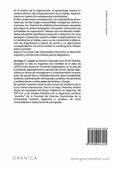 En el ámbito de la organización, el aprendizaje implica un cambio efectivo del comportamiento en el trabajo, especialmente en materia de competencias conductuales. El libro analiza estas competencias y las características personales que les dan origen: personalidad, inteligencia, valores y creencias, et. Examina las distintas intervenciones necesarias para lograr el cambio perseguido, incluyendo -entre otras- las actividades de capacitación. Destaca que las distingas modalidades educativas (enseñanza presencial, a distancia, etc.) que persiguen el desarrollo cognitivo deben complementarse con la transferencia al trabajo, que a su vez comprende la elaboración de diagnósticos y planes de acción y su seguimiento correspondiente, así como también el coaching para reforzar todo el proceso. Expone los temas más importantes inherentes al desarrollo cognitivo y brinda instrumentos para el diagnóstico. Santiago C. Lazzati es director asociado de la firma Deloite; actúa no sólo en la Argentina, sino también en el resto de LATCO (Latin American Countries Organization) en el área de Consultoría, especialmente en servicios de Human Capital; socio director de Lazzati y Sanguinetti Consultoría y Gobierno Corporativo; autor de quince libros y varios artículos sobre contabilidad, auditoría y administración de empresas; conductor de seminarios y conferencias en muchas países de América y Europa. Es también asesor de la Oficina de la Fiscalía (dirigida por el Dr. Luis Moreno Ocampo) de la Corte Criminal Internacional (La Haya, Holanda) y profesor titular de las facultades de Ciencias Económicas de la Universidad Católica Argentina y de la Universidad de Buenos Aires, además de profesor invitado de otras universidades e instituciones de posgrado.