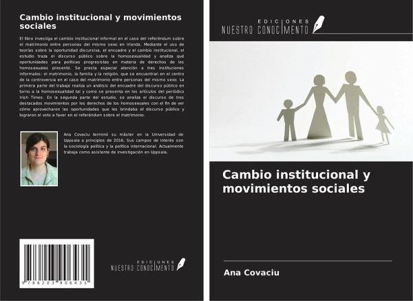 El libro investiga el cambio institucional informal en el caso del referéndum sobre el matrimonio entre personas del mismo sexo en Irlanda. Mediante el uso de teorías sobre la oportunidad discursiva, el encuadre y el cambio institucional, el estudio traza el discurso público sobre la homosexualidad y analiza qué oportunidades para políticas progresistas en materia de derechos de los homosexuales presentó. Se presta especial atención a tres instituciones informales: el matrimonio, la familia y la religión, que se encuentran en el centro de la controversia en el caso del matrimonio entre personas del mismo sexo. La primera parte del trabajo realiza un análisis del encuadre del discurso público en torno a la homosexualidad tal y como se presenta en los artículos del periódico Irish Times. En la segunda parte del estudio, se analiza el discurso de tres destacados movimientos por los derechos de los homosexuales con el fin de ver cómo aprovecharon las oportunidades que les brindaba el discurso público y lograron el voto a favor en el referéndum sobre el matrimonio.