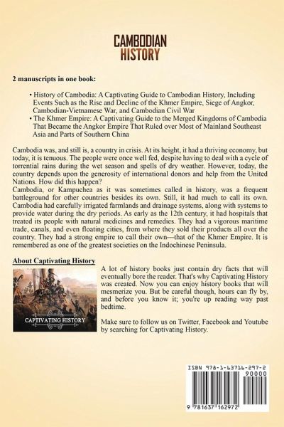 If you want to discover the captivating history of Cambodia, then keep reading... Two captivating manuscripts in one book:History of Cambodia: A Captivating Guide to Cambodian History, Including Events Such as the Rise and Decline of the Khmer Empire, Siege of Angkor, Cambodian-Vietnamese War, and Cambodian Civil War The Khmer Empire: A Captivating Guide to the Merged Kingdoms of Cambodia That Became the Angkor Empire That Ruled over Most of Mainland Southeast Asia and Parts of Southern China Did you know that Cambodia is home to Angkor Wat, the world's largest religious building? In 2009, a Cambodian historian took several walking tours of the war-ravaged country. He took photos, and one shows a discarded broken Buddhist statue lying in the green grasses beneath his feet. The artifact possibly dates back to the 1st century CE. Yet it lay there abandoned, instead of being housed in an honored place inside a glass cabinet in a museum. Scholars bemoan the fact that the deeds and even the names of Cambodian kings from its early times have faded like ghosts into the ethereal world of unwritten history. However, what is ensconced in glass cabinets in Cambodian museums are the many skulls of those who were executed by one of the most brutal regimes in the history of the world. Cambodia, or, as it was once known, Kampuchea, is a beautiful country, replete with an incredibly wondrous system of canals. But its history has been marked by the Khmer Rouge and Pol Pot, which brought the nation to its knees. Although it has risen from the ashes of genocide, it is still facing a major crisis today. Travel back in time to learn about Cambodia's past, one that was greatly influenced by various religions. For centuries, their beleaguered country was the battleground of many countries other than their own, and during the 20th century, their own men turned on each other. Some of the topics covered in part 1 of this book include:Cambodian prehistory The early kings of Cambodia Religious and regional influences The rise and fall of the Khmer Empire The French protectorate The Khmer Rouge and the Cambodian Civil War The Cambodian genocide Cambodia today And more Some of the topics covered in part 2 of this book include:Who were the Khmer people? Who was the devaraja that founded the Empire of Angkor? What is the symbolism behind some of the greatest temples in the world? Who built Angkor Wat, and with what purpose? How did a whole nation convert to Buddhism in under one century? Who was Jayavarman VII, and what made him the most powerful king of the Khmer? How did such a great empire fall into oblivion? How was it rediscovered and rebuilt? And much more! Scroll up and click the "add to cart" button to learn more about the History of Cambodia and the Khmer Empire!