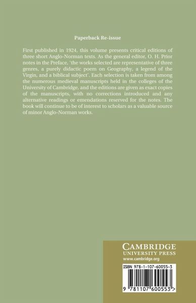 First published in 1924, this volume presents critical editions of three short Anglo-Norman texts. As the general editor, O. H. Prior notes in the Preface, 'the works selected are representative of three genres, a purely didactic poem on Geography, a legend of the Virgin, and a biblical subject'. Each selection is taken from among the numerous medieval manuscripts held in the colleges of the University of Cambridge, and the editions are given as exact copies of the manuscripts, with no corrections introduced and any alternative readings or emendations reserved for the notes. The book will continue to be of interest to scholars as a valuable source of minor Anglo-Norman works.