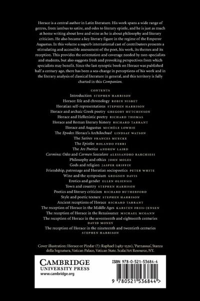 Horace is a central author in Latin literature. His work spans a wide range of genres, from iambus to satire, and odes to literary epistle, and he is just as much at home writing about love and wine as he is about philosophy and literary criticism. He also became a key literary figure in the regime of the Emperor Augustus. In this volume a superb international cast of contributors present a stimulating and accessible assessment of the poet, his work, its themes and its reception. This provides the orientation and coverage needed by non-specialists and students, but also suggests fresh and provoking perspectives from which specialists may benefit. Since the last general book on Horace was published half a century ago, there has been a sea-change in perceptions of his work and in the literary analysis of classical literature in general, and this territory is fully charted in this Companion.