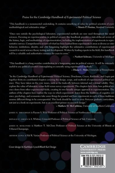 Laboratory experiments, survey experiments and field experiments occupy a central and growing place in the discipline of political science. The Cambridge Handbook of Experimental Political Science is the first text to provide a comprehensive overview of how experimental research is transforming the field. Some chapters explain and define core concepts in experimental design and analysis. Other chapters provide an intellectual history of the experimental movement. Throughout the book, leading scholars review groundbreaking research and explain, in personal terms, the growing influence of experimental political science. The Cambridge Handbook of Experimental Political Science provides a collection of insights that can be found nowhere else. Its topics are of interest not just to researchers who are conducting experiments today, but also to researchers who think that experiments can help them make new and important discoveries in political science and beyond.
