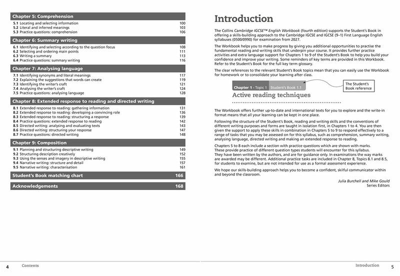The fourth edition of the Collins Cambridge IGCSE English Workbook helps students to consolidate learning, with further practice activities and language support to accompany the Student's Book. This Workbook supports the syllabuses for Cambridge IGCSE and IGCSE (9â 1) First Language English (0500/0990) for examination from 2027.