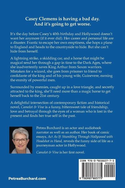 Casey Clemens is having a bad day. And it's going to get worse. It's the day before Casey's 40th birthday and Hollywood doesn't want her anymore (not that it ever did). Her career and personal life are a disaster. Frantic to escape her own emptiness, she hops a plane to England and heads to the countryside to hide. But she can't hide from herself. A lightning strike, a skidding car, and a horse that might be magical send her through a gap in time to the Dark Ages, where she inadvertently saves King Arthur from Saxon warriors. Mistaken for a wizard, she goes from prisoner to friend to confidante of the King and of his young wife, Guinevere, earning the enmity of powerful men. Surrounded by enemies, caught up in a love triangle and secretly attracted to the king, she'll need more than a magic horse to get herself back to the 21st century. A delightful intersection of contemporary fiction and historical novel, Camelot & Vine is a funny, bittersweet tale of friendship, love and betrayal through the eyes of a woman who is lost in the present and finds her true self in the past.