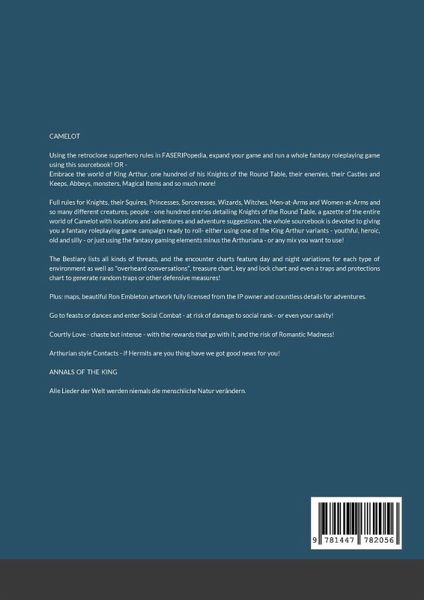 CAMELOT Using the retroclone superhero rules in FASERIPopedia, expand your game and run a whole fantasy roleplaying game using this sourcebook! OR - Embrace the world of King Arthur, one hundred of his Knights of the Round Table, their enemies, their Castles and Keeps, Abbeys, monsters, Magical Items and so much more! Full rules for Knights, their Squires, Princesses, Sorceresses, Wizards, Witches, Men-at-Arms and Women-at-Arms and so many different creatures, people - one hundred entries detailing Knights of the Round Table, a gazette of the entire world of Camelot with locations and adventures and adventure suggestions, the whole sourcebook is devoted to giving you a fantasy roleplaying game campaign ready to roll- either using one of the King Arthur variants - youthful, heroic, old and silly - or just using the fantasy gaming elements minus the Arthuriana - or any mix you want to use! The Bestiary lists all kinds of threats, and the encounter charts feature day and night variations for each type of environment as well as "overheard conversations", treasure chart, key and lock chart and even a traps and protections chart to generate random traps or other defensive measures! Plus: maps, beautiful Ron Embleton artwork fully licensed from the IP owner and countless details for adventures. Go to feasts or dances and enter Social Combat - at risk of damage to social rank - or even your sanity! Courtly Love - chaste but intense - with the rewards that go with it, and the risk of Romantic Madness! Arthurian style Contacts - if Hermits are you thing have we got good news for you! ANNALS OF THE KING Alle Lieder der Welt werden niemals die menschliche Natur verändern.