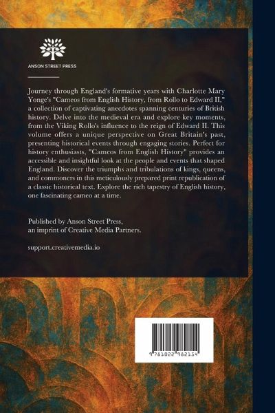 Journey through England's formative years with Charlotte Mary Yonge's "Cameos from English History, from Rollo to Edward II," a collection of captivating anecdotes spanning centuries of British history. Delve into the medieval era and explore key moments, from the Viking Rollo's influence to the reign of Edward II. This volume offers a unique perspective on Great Britain's past, presenting historical events through engaging stories. Perfect for history enthusiasts, "Cameos from English History" provides an accessible and insightful look at the people and events that shaped England. Discover the triumphs and tribulations of kings, queens, and commoners in this meticulously prepared print republication of a classic historical text. Explore the rich tapestry of English history, one fascinating cameo at a time. This work has been selected by scholars as being culturally important, and is part of the knowledge base of civilization as we know it. This work is in the public domain in the United States of America, and possibly other nations. Within the United States, you may freely copy and distribute this work, as no entity (individual or corporate) has a copyright on the body of the work. Scholars believe, and we concur, that this work is important enough to be preserved, reproduced, and made generally available to the public. We appreciate your support of the preservation process, and thank you for being an important part of keeping this knowledge alive and relevant.