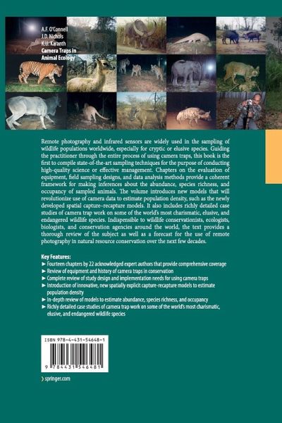 1. Introduction: Allan F. O'Connell, James D. Nichols, and K. Ullas Karanth.- 2. A History of Camera Trapping: Thomas E. Kucera and Reginald H. Barrett.- 3. Evaluating Types and Features of Camera Traps in Ecological Studies: A Guide for Researchers: Don E. Swann, Kae Kawanishi, and Jonathan Palmer.- 4. Science, Conservation, and Camera Traps: James D. Nichols, K. Ullas Karanth, and Allan F. O'Connell.- 5. Behavior and Activity Patterns: Andrew S. Bridges and Andrew J. Noss.- 6. Abundance, Density and Relative Abundance: A Conceptual Framework: Timothy G. O'Brien.- 7. Estimating Tiger Abundance from Camera Trap Data: Field Surveys and Analytical Issues: K. Ullas Karanth, James D. Nichols, and N. Samba Kumar.- 8. Abundance/Density Case Study: Jaguars in the Americas: Leonardo Maffei, Andrew J. Noss, Scott C. Silver, and Marcella J. Kelly.- 9. Estimation of Demographic Parameters in a Tiger Population from Long-term Camera Trap Data: K. Ullas Karanth, James D. Nichols, N. Samba Kumar, and Devcharan Jathanna.- 10. Hierarchical Spatial Capture-Recapture Models for Estimating Density from Trapping Arrays: J. Andrew Royle and Beth Gardner.- 11. Inference for Occupancy and Occupancy Dynamics: Allan F. O'Connell Jr and Larissa L. Bailey.- 12. Species Richness and Community Dynamics: A Conceptual Framework: Marc Kéry.- 13. Estimation of Species Richness of Large Vertebrates Using Camera Traps: An Example from an Indonesian Rainforest: Timothy G. O'Brien, Margaret F. Kinnaird, and Hariyo T. Wibisono.- 14. Camera Traps in Animal Ecology and Conservation: What's Next?: James D. Nichols, Allan F. O'Connell, and K. Ullas Karanth.- Index.