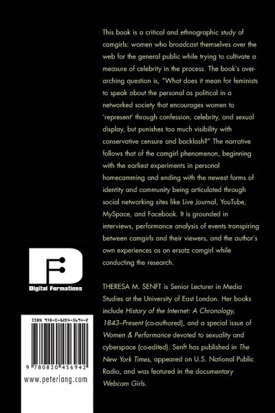 This book is a critical and ethnographic study of camgirls: women who broadcast themselves over the web for the general public while trying to cultivate a measure of celebrity in the process. The book's over-arching question is, "What does it mean for feminists to speak about the personal as political in a networked society that encourages women to 'represent' through confession, celebrity, and sexual display, but punishes too much visibility with conservative censure and backlash?" The narrative follows that of the camgirl phenomenon, beginning with the earliest experiments in personal homecamming and ending with the newest forms of identity and community being articulated through social networking sites like Live Journal, YouTube, MySpace, and Facebook. It is grounded in interviews, performance analysis of events transpiring between camgirls and their viewers, and the author's own experiences as an ersatz camgirl while conducting the research.