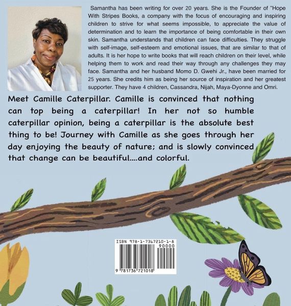 Meet Camille Caterpillar. Camille is convinced that nothing can top being a caterpillar. In her not so humble caterpillar opinion, being a caterpillar is the absolute best thing to be! Journey with Camille as she goes through her day enjoying the beauty of nature; and is slowly convinced that change can be beautiful...and colorful.