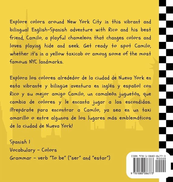 Camilo's Colorful Adventure in NYC/La colorida aventura de Camilo en la ciudad de Nueva York Explore colors around New York City in this vibrant and bilingual English-Spanish adventure with Rico and his best friend, Camilo, a playful chameleon that changes colors and loves playing hide and seek. Get ready to spot Camilo, whether it's in a yellow taxicab or among some of the most famous NYC landmarks. Explora los colores alrededor de la Ciudad de Nueva York en esta vibrante y bilingüe aventura en inglés y español con Rico y su mejor amigo, Camilo, un camaleón juguetón que cambia de colores y le encanta jugar al escondite. ¡Prepárate para encontrar a Camilo, ya sea en un taxi amarillo o entre algunos de los lugares más emblemáticos de la ciudad de Nueva York! Spanish 1 Vocabulary - Colors Grammar - verb "To be" ("ser" and "estar")