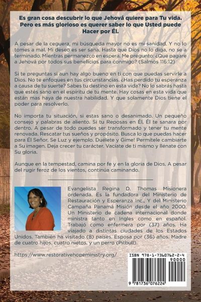 Es gran cosa descubrir lo que Jehová quiere para Tu vida. Pero es más glorioso es querer saber lo que Usted puede Hacer por Él. A pesar de la ceguera, mi búsqueda mayor no es mi sanidad. Y no lo tomes a mal. Mi deseo es ser sana. Hasta que Dios no lo diga, no se a terminado. Mientras permanezco en espera. Me pregunto: ¿Que pagare a Jehová por todos sus beneficios para conmigo? (Salmos 116:12) Si te preguntas si aun hay algo bueno en ti con que puedas servirle a Dios. No te enfoques en tus circunstancias. ¿Has perdido tu esperanza a causa de tu suerte? Sabes tu destino en esta vida? No lo sabrás hasta que estés sano en el espíritu de tu mente. Hay cosas en esta vida que están mas haya de nuestra habilidad. Y que solamente Dios tiene el poder para resolverlo. No importa tu situación, si estas sano o desanimado. Un pequeño consejo y palabras de aliento. Si tu Reposas en Él, Él te sanara por dentro. A pesar de todo puedes ser transformado y tener tu mente renovada. Rescatar tus sueños y propósito. Busca lo que puedas hacer para Él Señor. Se Luz y ejemplo. Duélete y Gime! Permítele cambiarte a Su imagen. Deja crecer tu carácter. Vacíate de ti mismo y llénate con Su gloria. Aunque en la tempestad, camina por fe y en la gloria de Dios. A pesar del rugir feroz de los vientos, continúa caminando.