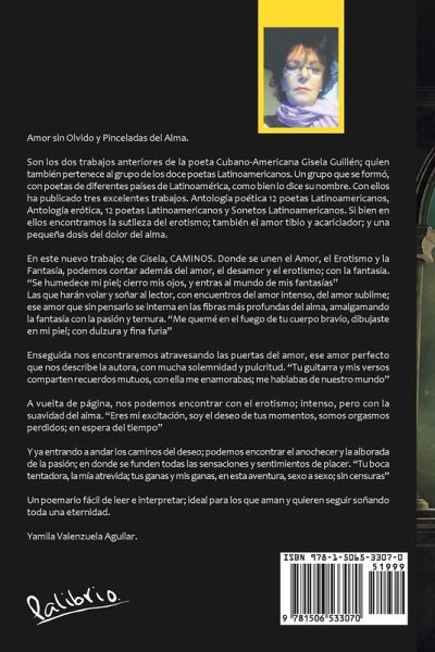 Amor sin Olvido y Pinceladas del Alma. Son los dos trabajos anteriores de la poeta Cubano-Americana Gisela Guillén; quien también pertenece al grupo de los doce poetas Latinoamericanos. Un grupo que se formó, con poetas de diferentes países de Latinoamérica, como bien lo dice su nombre. Con ellos ha publicado tres excelentes trabajos. Antología poética 12 poetas Latinoamericanos, Antología erótica, 12 poetas Latinoamericanos y Sonetos Latinoamericanos. Si bien en ellos encontramos la sutileza del erotismo; también el amor tibio y acariciador; y una pequeña dosis del dolor del alma. En este nuevo trabajo; de Gisela, CAMINOS. Donde se unen el Amor, el Erotismo y la Fantasía, podemos contar además del amor, el desamor y el erotismo; con la fantasía. "Se humedece mi piel; cierro mis ojos, y entras al mundo de mis fantasías" Las que harán volar y soñar al lector, con encuentros del amor intenso, del amor sublime; ese amor que sin pensarlo se interna en las fibras más profundas del alma, amalgamando la fantasía con la pasión y ternura. "Me quemé en el fuego de tu cuerpo bravío, dibujaste en mi piel; con dulzura y fina furia" Enseguida nos encontraremos atravesando las puertas del amor, ese amor perfecto que nos describe la autora, con mucha solemnidad y pulcritud. "Tu guitarra y mis versos comparten recuerdos mutuos, con ella me enamorabas; me hablabas de nuestro mundo" A vuelta de página, nos podemos encontrar con el erotismo; intenso, pero con la suavidad del alma. "Eres mi excitación, soy el deseo de tus momentos, somos orgasmos perdidos; en espera del tiempo" Y ya entrando a andar los caminos del deseo; podemos encontrar el anochecer y la alborada de la pasión; en donde se funden todas las sensaciones y sentimientos de placer. "Tu boca tentadora, la mía atrevida; tus ganas y mis ganas, en esta aventura, sexo a sexo; sin censuras" Un poemario fácil de leer e interpretar; ideal para los que aman y quieren seguir soñando toda una eternidad. Yamila Valenzuela Aguilar.