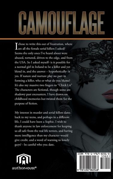 I chose to write this out of frustration, where are all the female serial killers I asked? Seems the only ones I've heard about were abused, tortured, driven to the edge, and from the USA. So I asked myself- is it possible for a normal girl in Ireland to be a killer and yet blend in, and the answer - hypothetically- is yes. If nature and nurture play no part in forming a killer, who or what do you blame? It's also my massive two fingers to "Chick Lit" The characters are fictional, though some are shadowy past encounters. I have drawn on childhood memories but twisted them for the purpose of fiction. My interest in murder and serial killers dates back to my teens, and perhaps in a different life, I could have been a Sophie. I wish to thank anyone in law enforcement for keeping us all safe from the real life terrors, and having more intelligence than my character would give credit. and a word of warning to lonely guys? - be careful who you date.