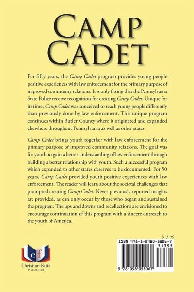 For fifty years, the Camp Cadet program provides young people positive experiences with law enforcement for the primary purpose of improved community relations. It is only fitting that the Pennsylvania State Police receive recognition for creating Camp Cadet. Unique for its time, Camp Cadet was conceived to reach young people differently than previously done by law enforcement. This unique program continues within Butler County where it originated and expanded elsewhere throughout Pennsylvania as well as other states. Camp Cadet brings youth together with law enforcement for the primary purpose of improved community relations. The goal was for youth to gain a better understanding of law enforcement through building a better relationship with youth. Such a successful program which expanded to other states deserves to be documented. For 50 years, Camp Cadet provided youth positive experiences with law enforcement. The reader will learn about the societal challenges that prompted creating Camp Cadet. Never previously reported insights are provided, as can only occur by those who began and sustained the program. The ups and downs and recollections are envisioned to encourage continuation of this program with a sincere outreach to the youth of America.