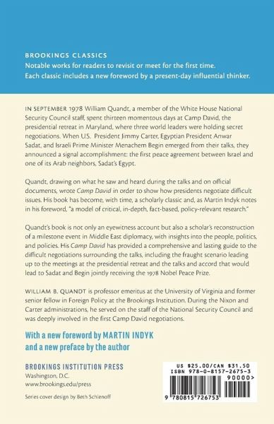 In September 1978 William Quandt, a member of the White House National Security Council staff, spent thirteen momentous days at Camp David, the presidential retreat in Maryland, where three world leaders were holding secret negotiations. When U.S. President Jimmy Carter, Egyptian President Anwar Sadat, and Israeli Prime Minister Menachem Begin emerged from their talks, they announced a signal accomplishment: the first peace agreement between Israel and one of its Arab neighbors, Sadat’s Egypt.Quandt, drawing on what he saw and heard during the talks and on official documents, wrote Camp David in order to show how presidents negotiate difficult issues. His book has become, with time, a scholarly classic and, as Martin Indyk notes in his foreword, a model of critical, in-depth, fact-based, policy-relevant research.”Quandt’s book is not only an eyewitness account but also a scholar’s reconstruction of a milestone event in Middle East diplomacy, with insights into the people, politics, and policies. His Camp David has provided a comprehensive and lasting guide to the difficult negotiations surrounding the talks, including the fraught scenario leading up to the meetings at the presidential retreat and the talks and accord that would lead to Sadat and Begin jointly receiving the 1978 Nobel Peace Prize.