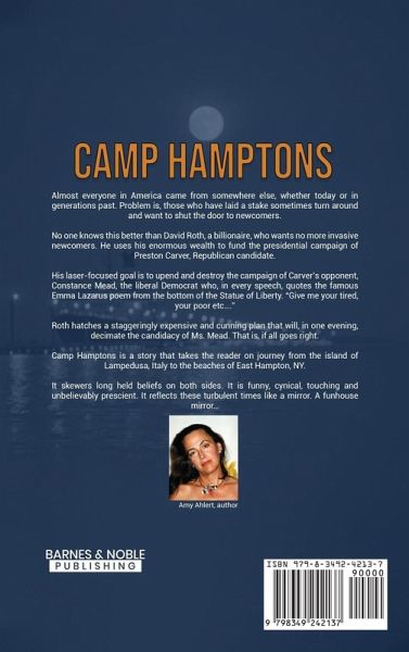 Almost everyone in America came from somewhere else, whether today or in generations past. Problem is, those who have laid a stake sometimes turn around and want to shut the door to newcomers. No one knows this better than David Roth, a billionaire, who wants no more invasive newcomers. He uses his enormous wealth to fund the presidential campaign of Preston Carver, Republican candidate. His laser-focused goal is to upend and destroy the campaign of Carver's opponent, Constance Mead, the liberal Democrat who, in every speech, quotes the famous Emma Lazarus poem from the bottom of the Statue of Liberty. "Give me your tired, your poor etc...." Roth hatches a staggeringly expensive and cunning plan that will, in one evening, decimate the candidacy of Ms. Mead. That is, if all goes right. Camp Hamptons is a story that takes the reader on journey from the island of Lampedusa, Italy to the beaches of East Hampton, NY. It skewers long held beliefs on both sides. It is funny, cynical, touching and unbelievably prescient. It reflects these turbulent times like a mirror. A funhouse mirror...