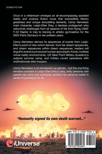 Once in a millennium emerges an all-encompassing assisted reality and science fiction novel that exemplifies literary greatness and unique storytelling dexterity. Camp Nameless main character, Leigh-Ellen Srey, a fearless protagonist who welcomes challenges from all aspects of life from flying USAF F-22 Raptor in Iraq to training in artistic gymnastics for the 2024 Paris Olympics in her preteen years. Camp Nameless derives its sequences of events from Leigh- Ellen's point of view which derives from her dream sequences, and dream sequences within dream sequences; readers will engulf in events such as post nuclear apocalyptic Korea, multiple virtual reality environments, US West Point Military Academy's outpost summer camp, and military covert operations with multinationals elite troopers. Camp Nameless is an enmeshed-up genres...but the one thing remains constant is Leigh-Ellen Srey's zany, witty persona: she speaks her mind and outwardly exhibits her personal belief in sense of judicatory for all.