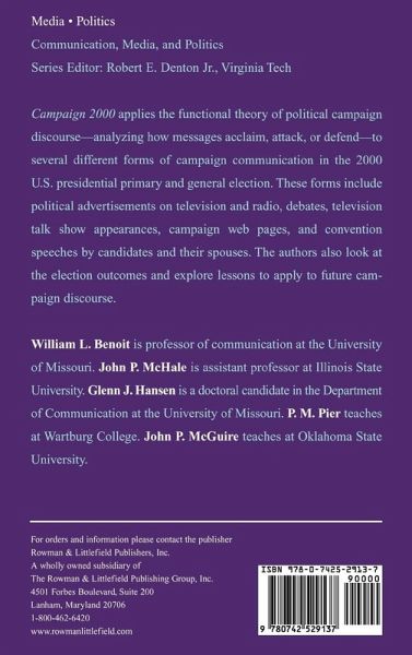 Campaign 2000 applies the functional theory of political campaign discourse-analyzing how messages acclaim, attack, or defend-to several different forms of campaign communication in the 2000 U.S. presidential primary and general election. These forms include political advertisements on television and radio, debates, television talk show appearances, campaign web pages, and convention speeches by candidates and their spouses. The authors also look at the election outcomes and explore lessons to apply to future campaign discourse.